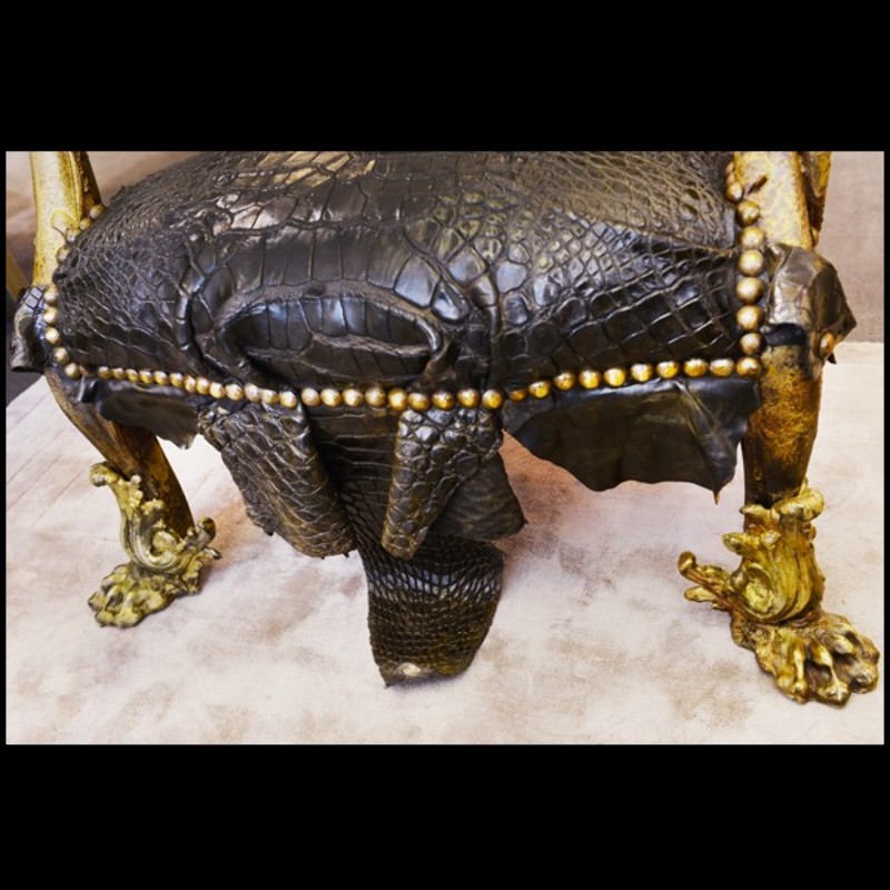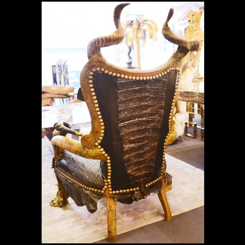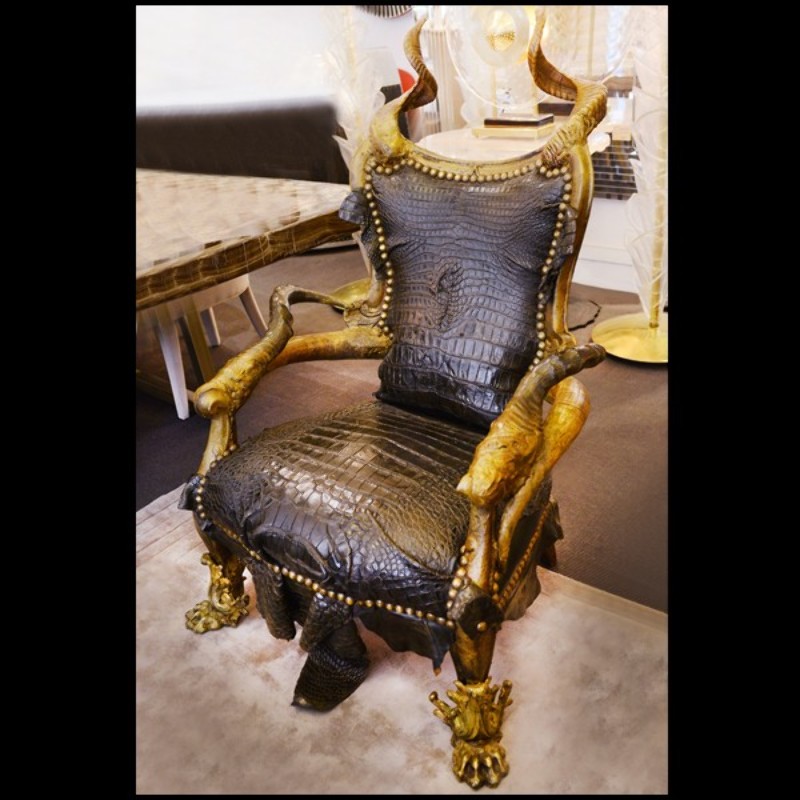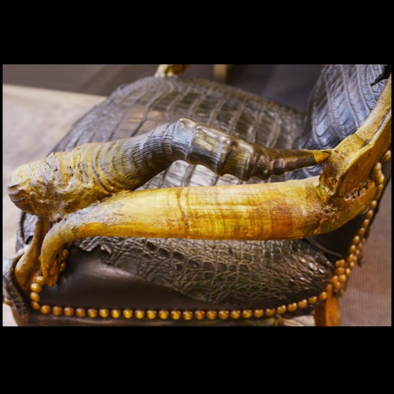 Armchair covered with black tinted real alligator skin and with real horns 120-Black Croco