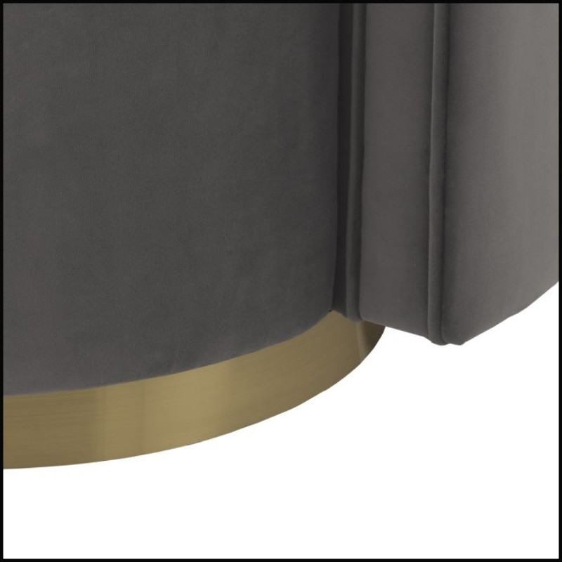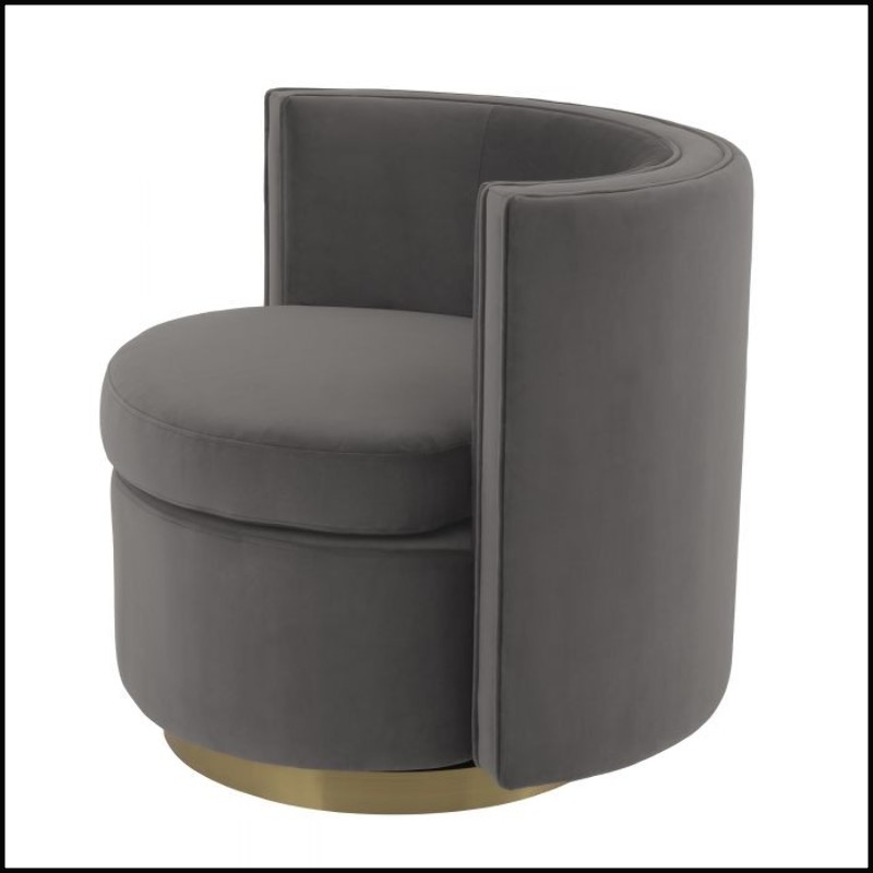 This armchair has a swivel base in brush brass finish, upholstered in Savona Grey velvet.