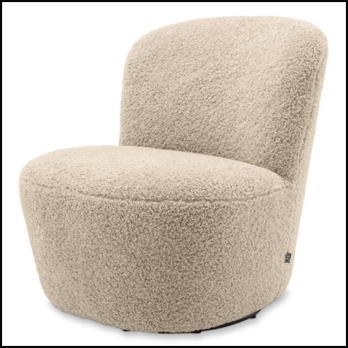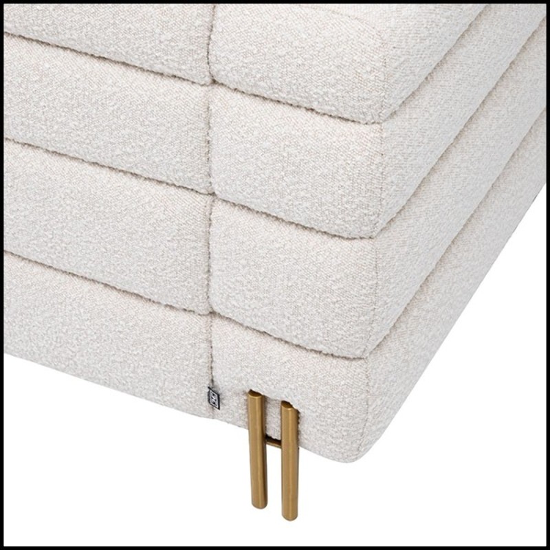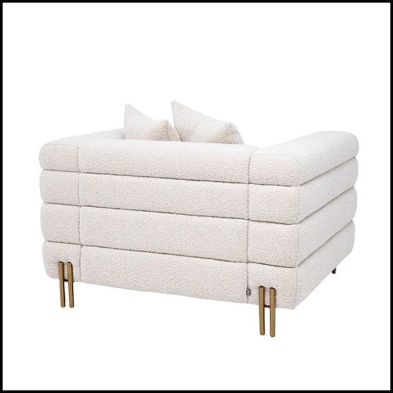 Its cream bouclé fabric upholstery and brushed brass finish legs add a