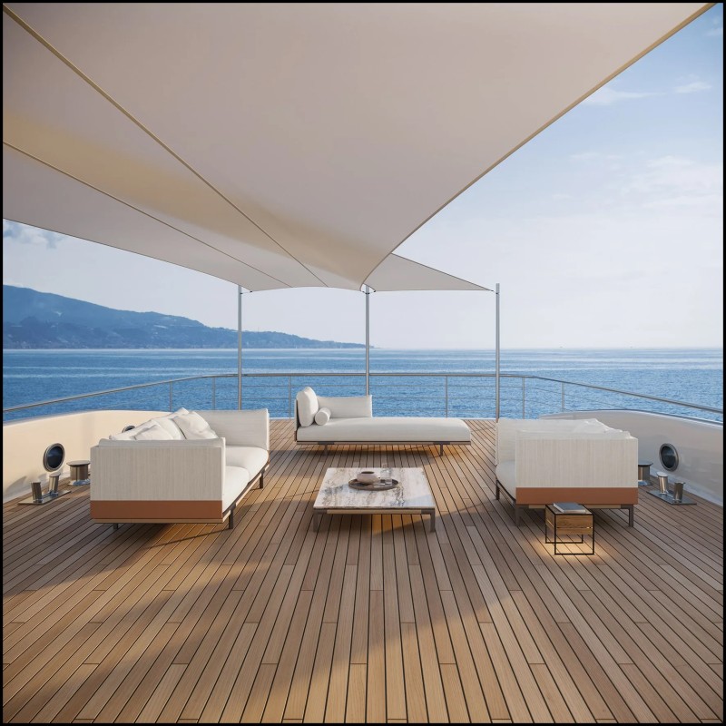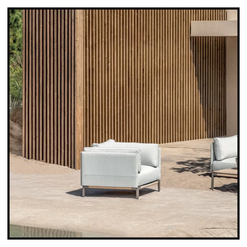 Baia is an outdoor armchair covered in neutral-colored fabrics,