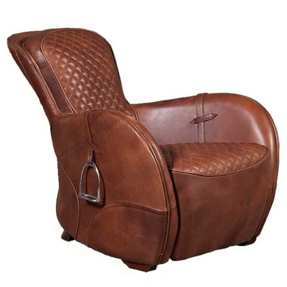 The stitched leather seat and back are extremely elegant. Leather straps complete with nickel stirrups hang on each side of the armrests. This armchair is a signature of all major international races where mythical horses run against each other.
