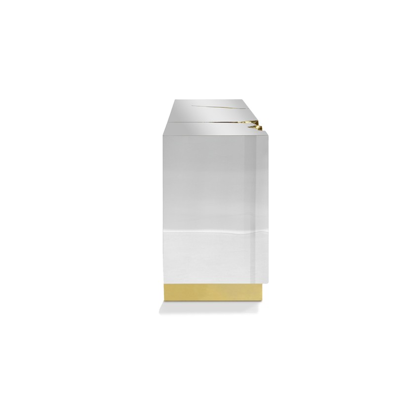 The wood and polished brass complement each other perfectly, offering a visual contrast that adds depth to the overall piece. The rectilinear shape of the buffet and the light accents created by the polished brass give a contemporary feel to the room.