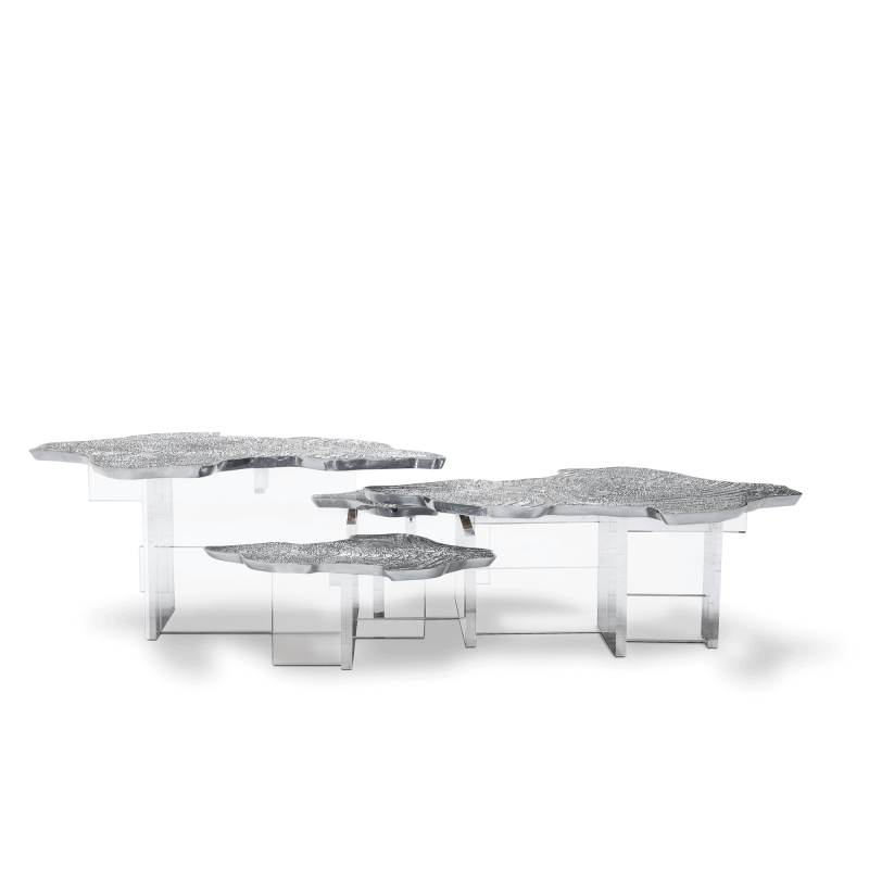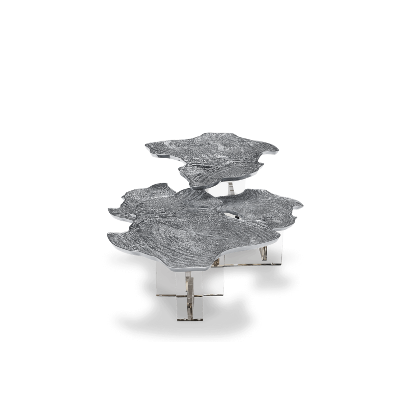 The coffee table features high-quality metallic finishes and offers a sense of solidity due to its acrylic or wooden base. The various color options, ranging from copper to patina, allow it to adapt to different decorative styles, from contemporary to classic.