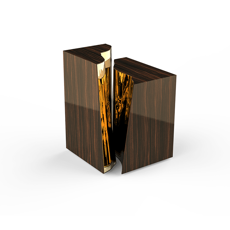 Material : Polished stainless steel, brass, wood structure | Poplar root veneer, polished brass, wood structure | Ebony macassar veneer, polished brass | Walnut root veneer, polished brass