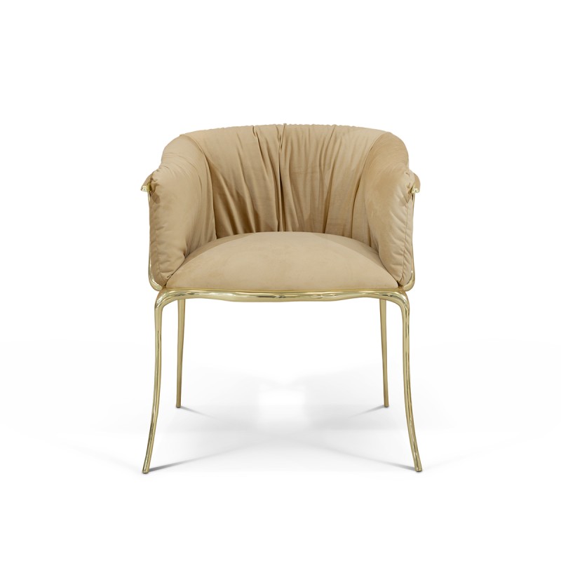 The N11 Armchair by Boca Do Lobo is perfect for a living room or entrance hall, combining solid brass with synthetic suede-effect fabric for a refined look.