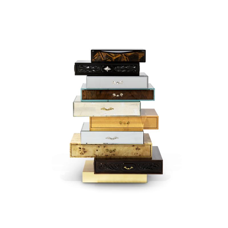 The Frank Chest by Boca Do Lobo is a luxurious creation that combines elegance and refinement, ideal for a dressing room or bedroom. The chest of drawers is made of gold leaf finished in a high gloss varnish, old mirror, wood veneers, glass, and copper leaf, offering a sophisticated touch.