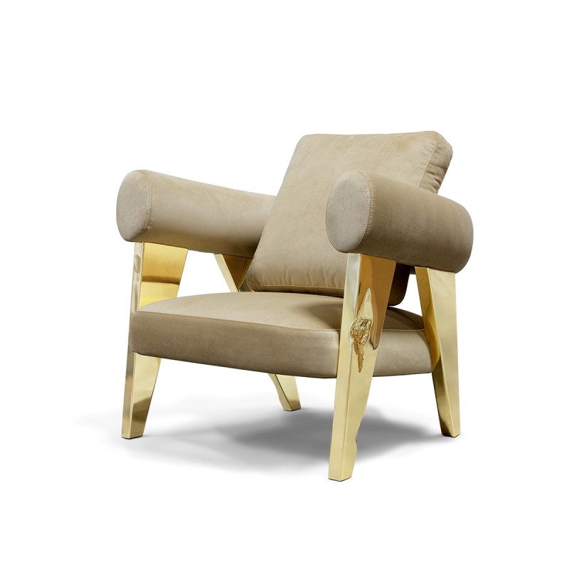 The combination of noble materials such as polished brass and fabric, gives this armchair a bolder design and a feeling of wellness. The hammered details on the polished brass legs add a touch of classic elegance, while the overall shape of the armchair evokes a contemporary ambiance.