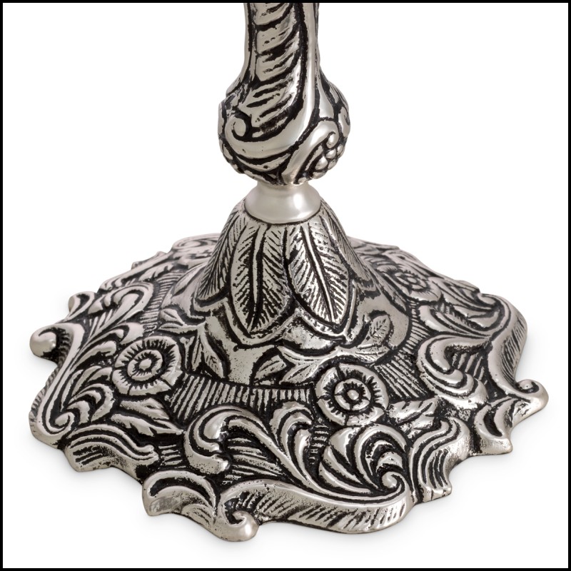 The antique silver plating used for this candle holder gives it a unique patina and timeless beauty, while the warmth sensation it provides evokes a feeling of comfort and intimacy. With its precise dimensions (L. 16, 5 | W. 17 | H. 27, 5 cm), it easily adapts to any space, offering great flexibility in placement.