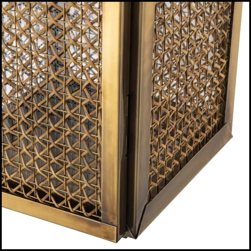 Hurricane Candlephore L features a structure in stainless steel in vintage brass structure and rattan.