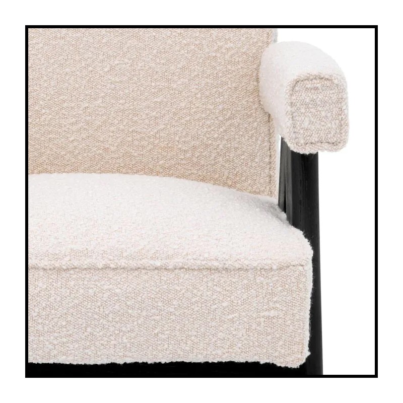 a distinctive black finish and original V-shaped legs. Its cream bouclé