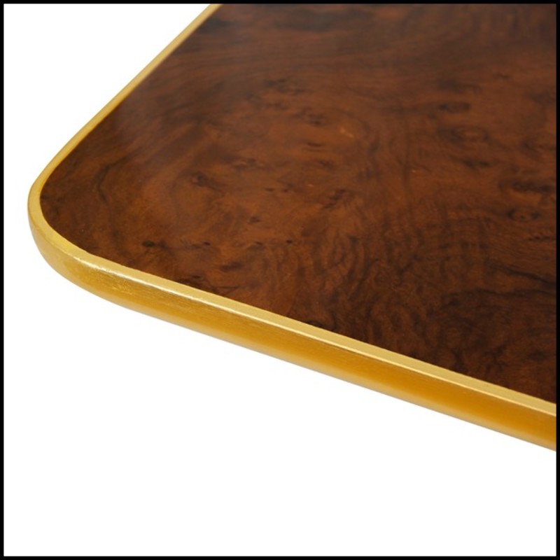Its varnished solid walnut root top highlights the natural richness of the wood, while the edge delicately finished with gold leaf adds a luminous and luxurious accent. The piece rests on a solid walnut wood base, enhanced by a glossy black finish that reinforces its contemporary and elegant appeal.