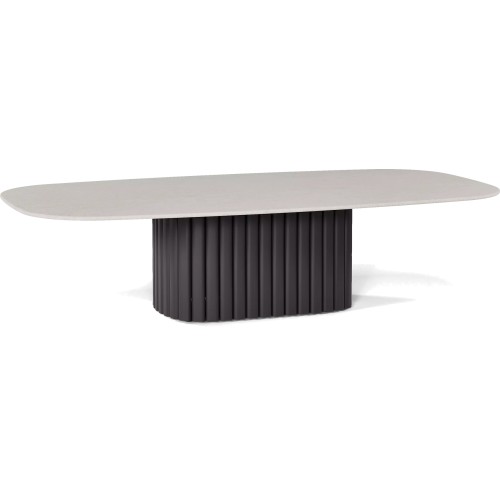 Featuring a powder coated aluminium base, this coffee table boasts a minimalist aesthetic that seamlessly integrates into contemporary outdoor settings, while its surface creates a warm and inviting space to share moments with loved ones.