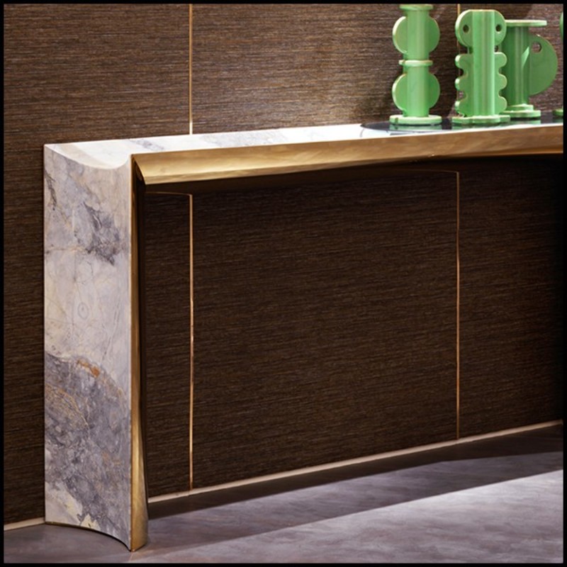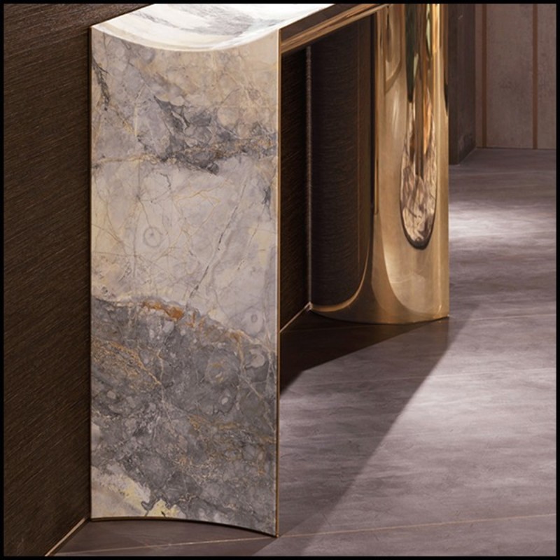 in gold finish with concave sides shaped in solid polished light grey marble.