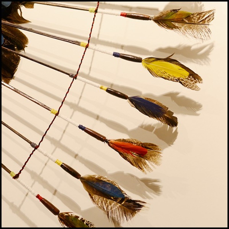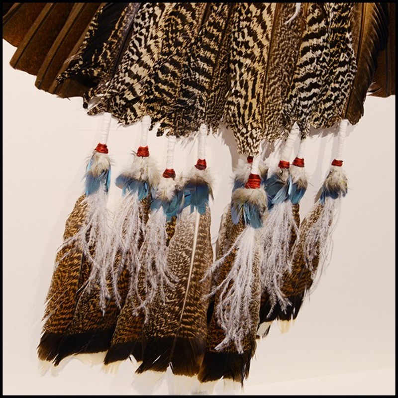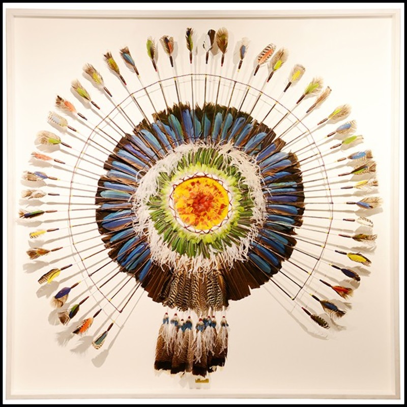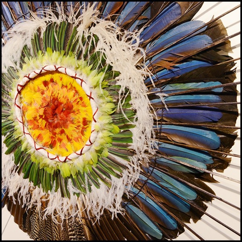 Indian Tribe Headdress under frame made with blue Macaw feathers,