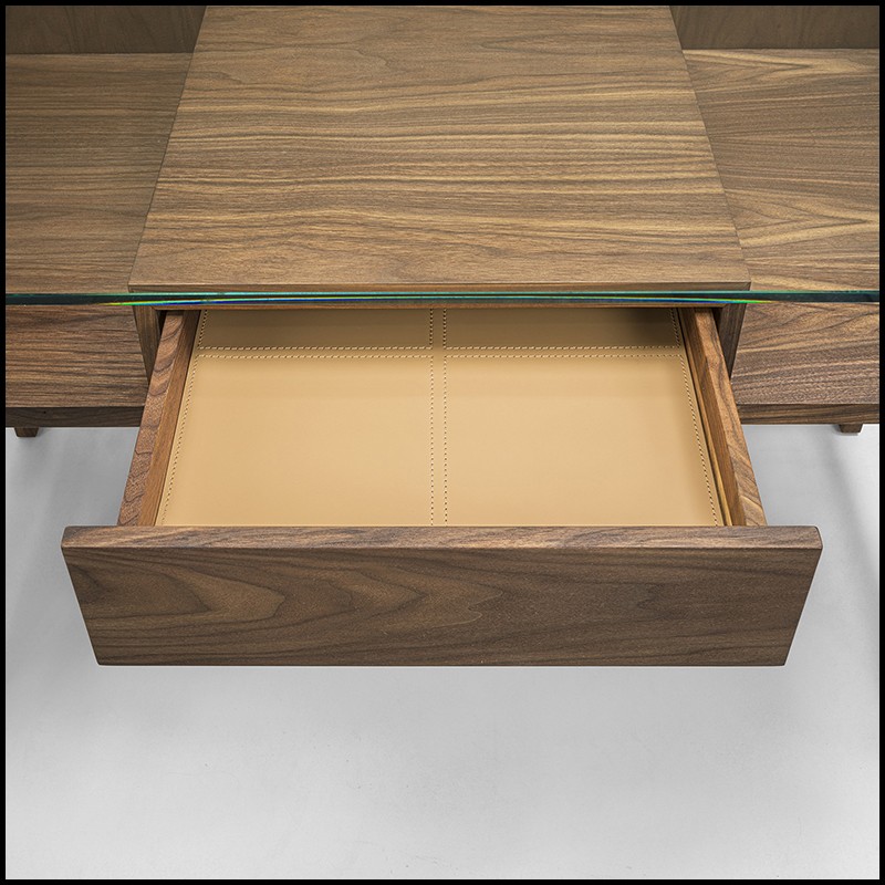Solid walnut desk with glass top and drawer lined in light camel Italian leather.