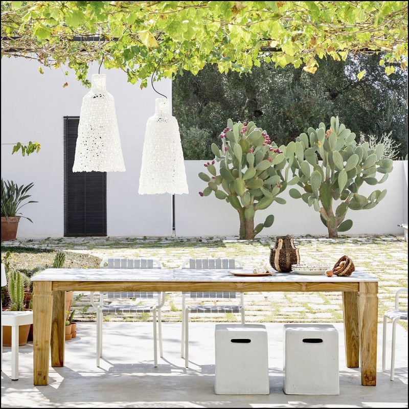 with its Carrara white marble and solid teak top, offering a touch of high-end