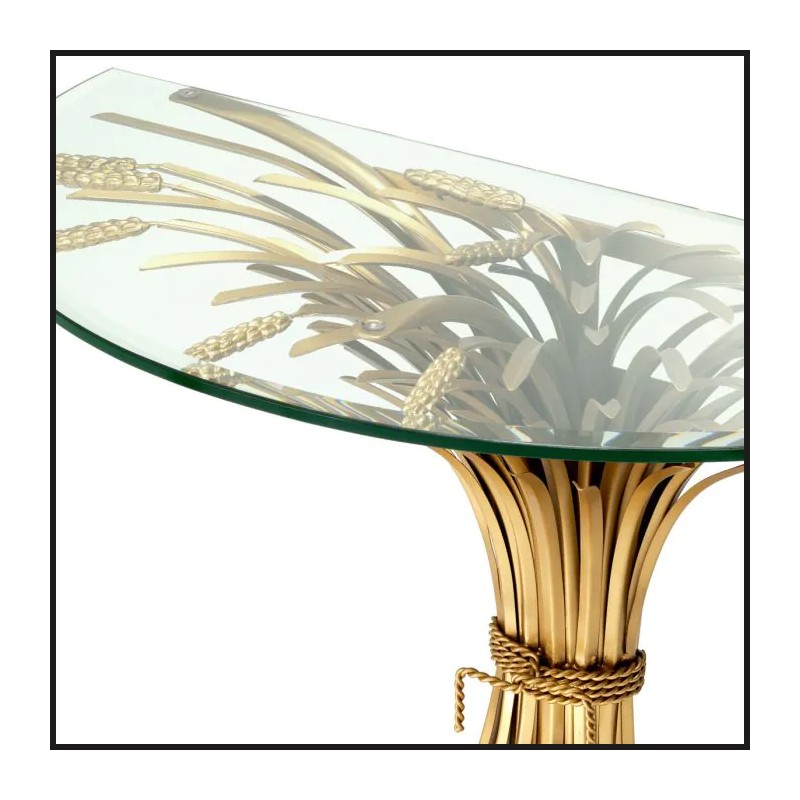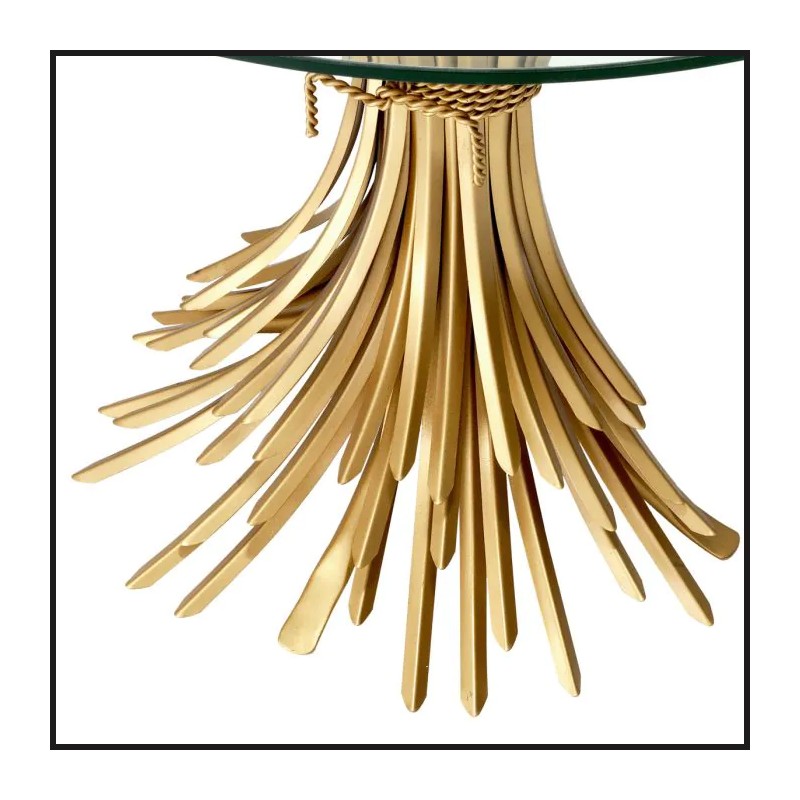a sheaf-shaped base and a bevelled clear glass tabletop.