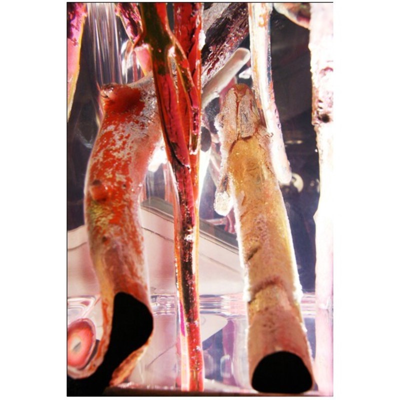 of branches of lacquered driftwood in a mix of red, pink and orange fluo, all captured