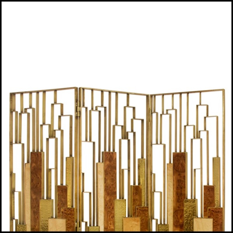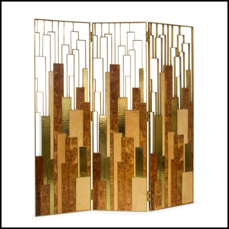 Its polished brass structure, combined with varnished elm wood veneer panels, creates a harmonious contrast between shine and natural warmth. This blend of materials gives the screen a refined presence and a distinctly high-end character.