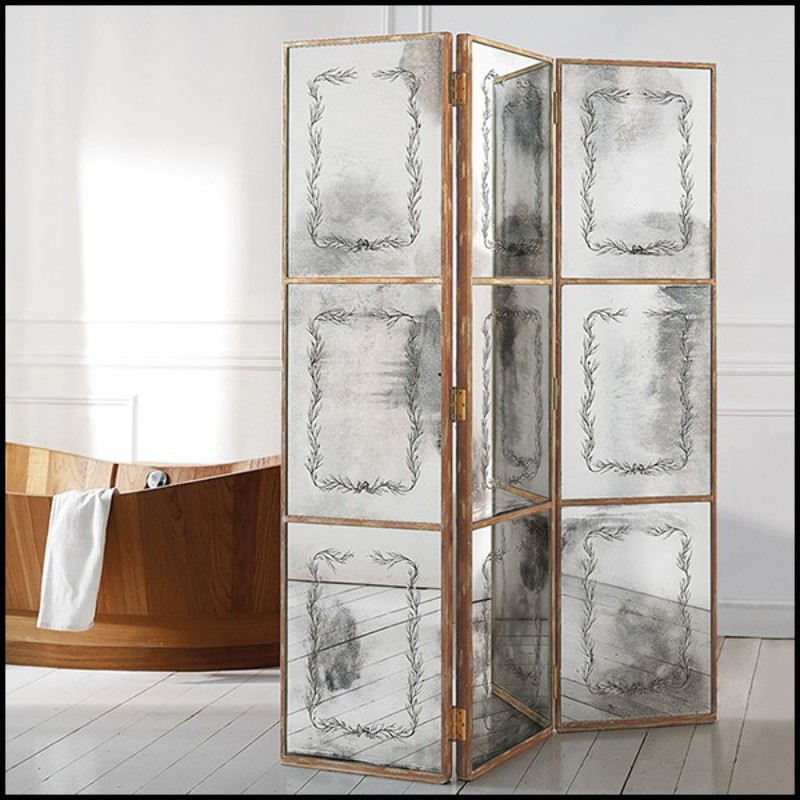 Each panel is covered with engraved glass tiles in mirrored antique finish.