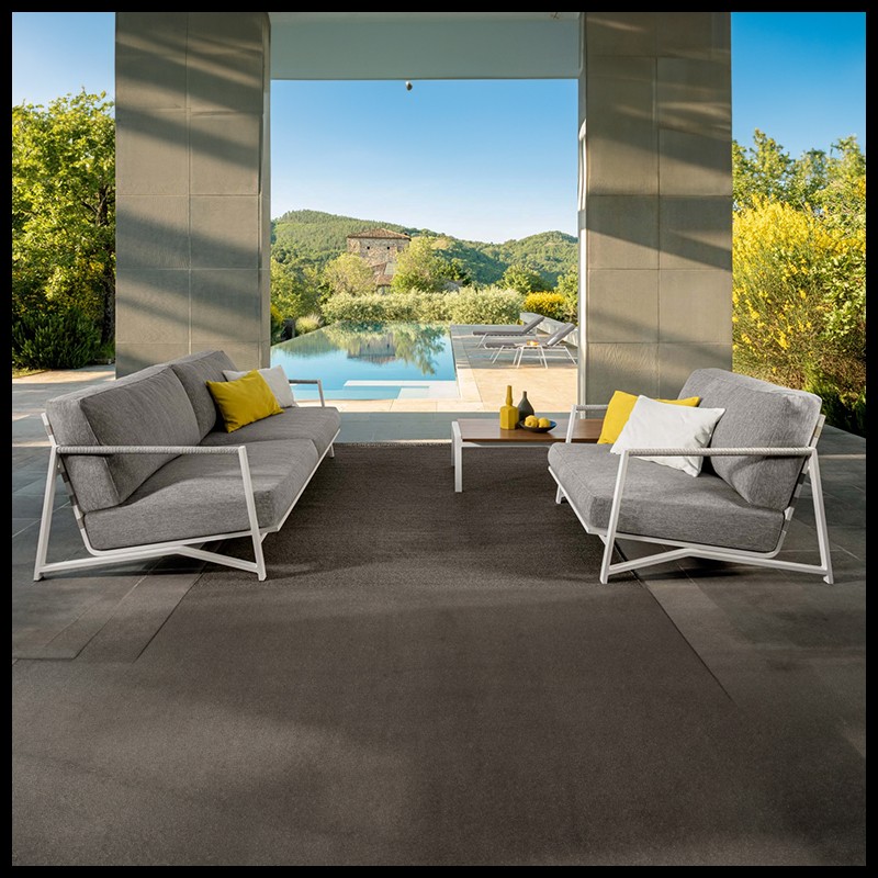 sofa, designed by Talenti, combines a robust aluminum structure with