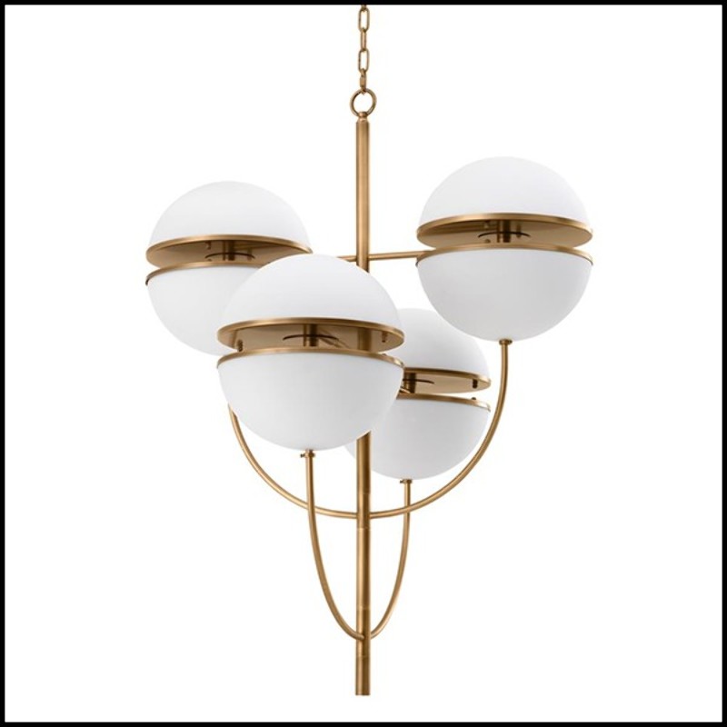 Chandelier Spiridon with structure in antique brass finish and white glass.