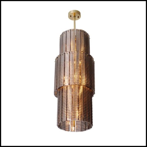 chandelier combines brushed brass and smoked glass for high-end lighting.