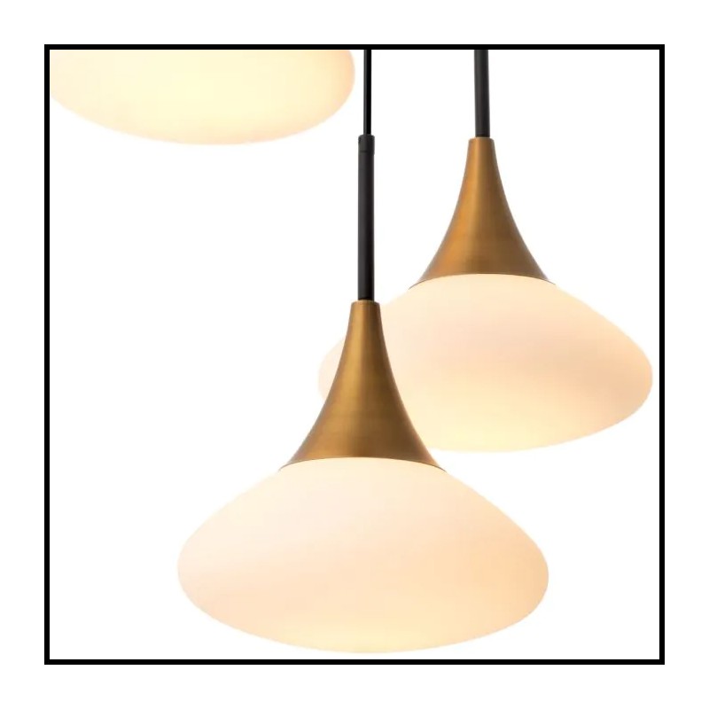 Hanging from a round ceiling plate and provided with an antique brass finish,