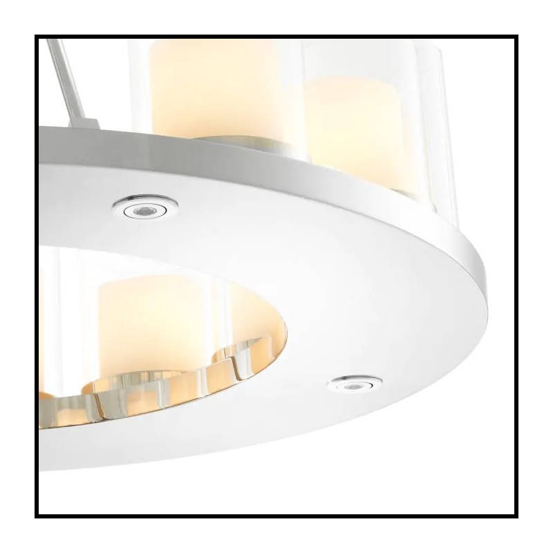 This atmospheric chandelier nestles 12 exquisite glass hurricane lanterns
