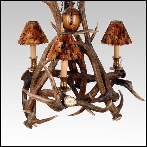 Chandelier with 3 deer antlers with vintage brass finish and 3 partridge feather lamp shade 141-Three Antlers