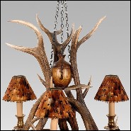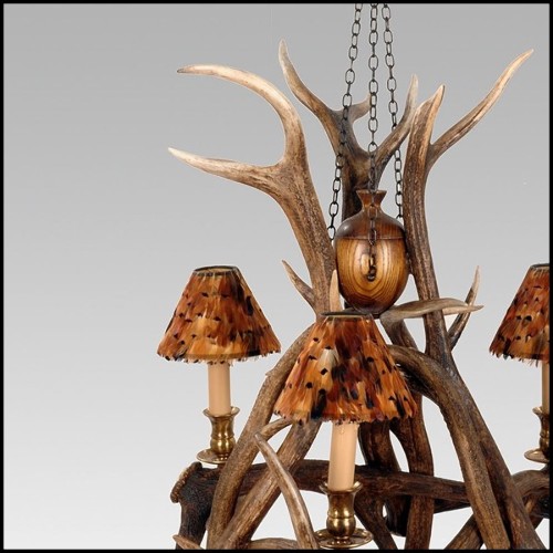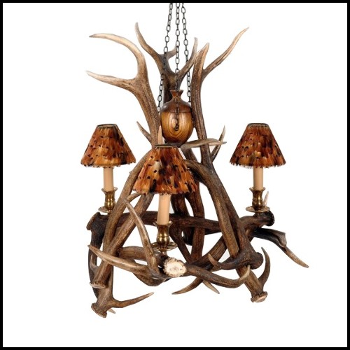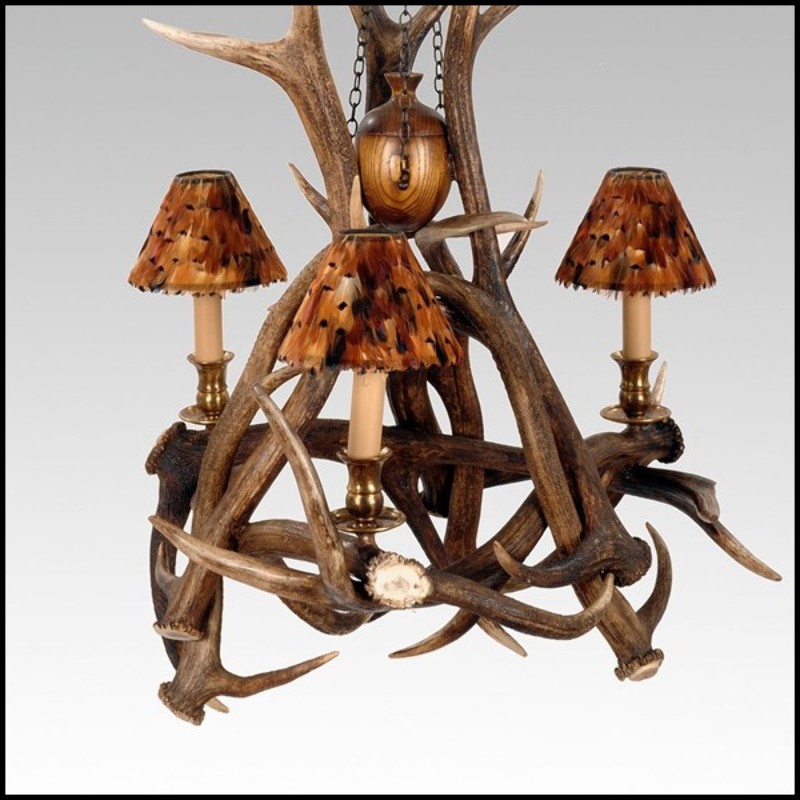 Chandelier with 3 deer antlers with vintage brass finish and 3 partridge feather lamp shade 141-Three Antlers