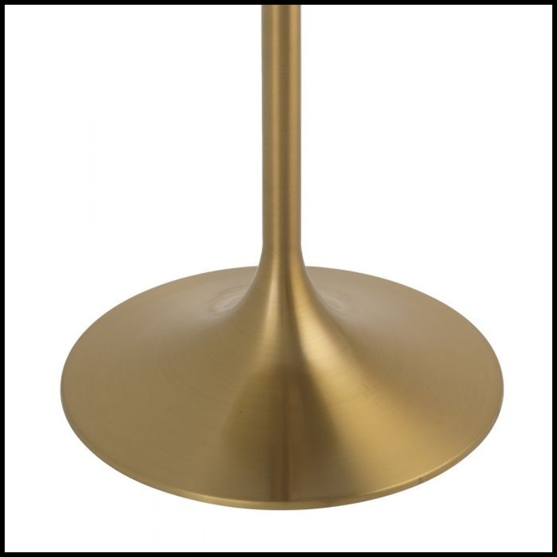 Its circular ceramic top with marble look is supported by a brushed brass column