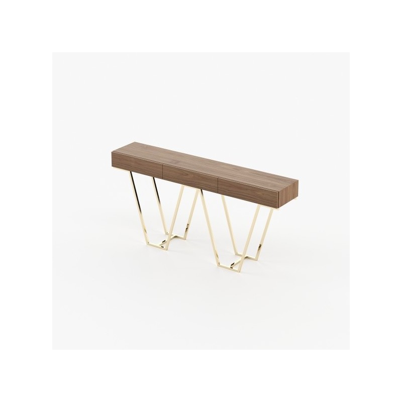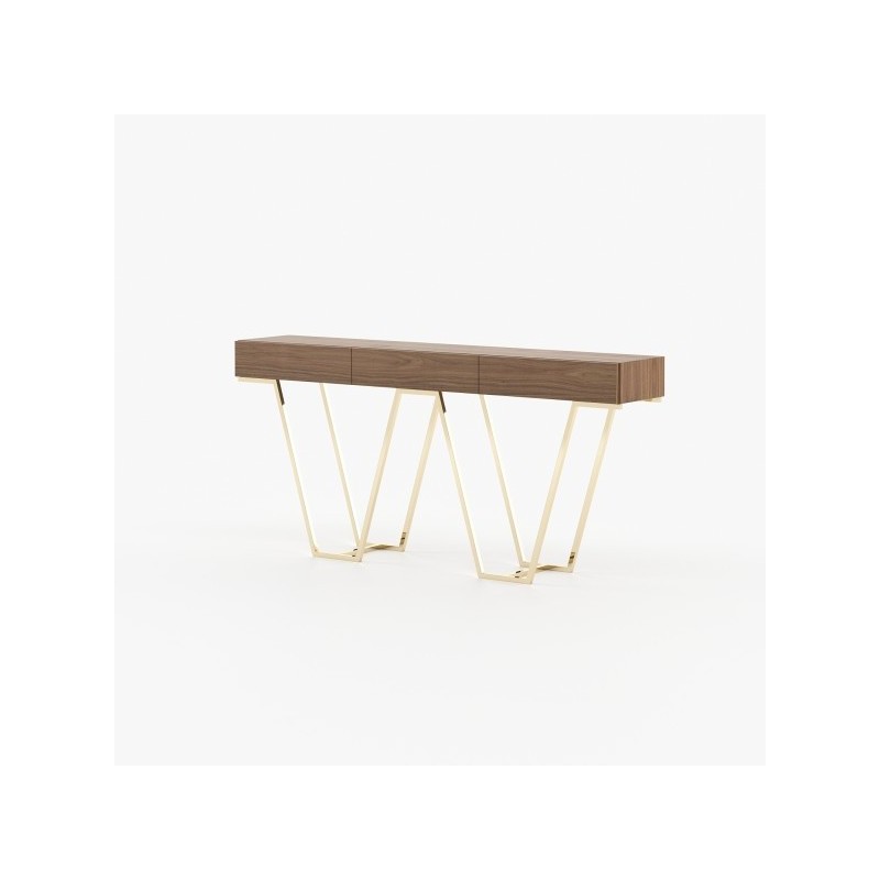 The Zurique Console by Laskasas is designed to be a central element in an entry hall or living room, offering a mix of wood and metal for a contemporary style.