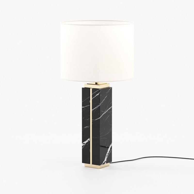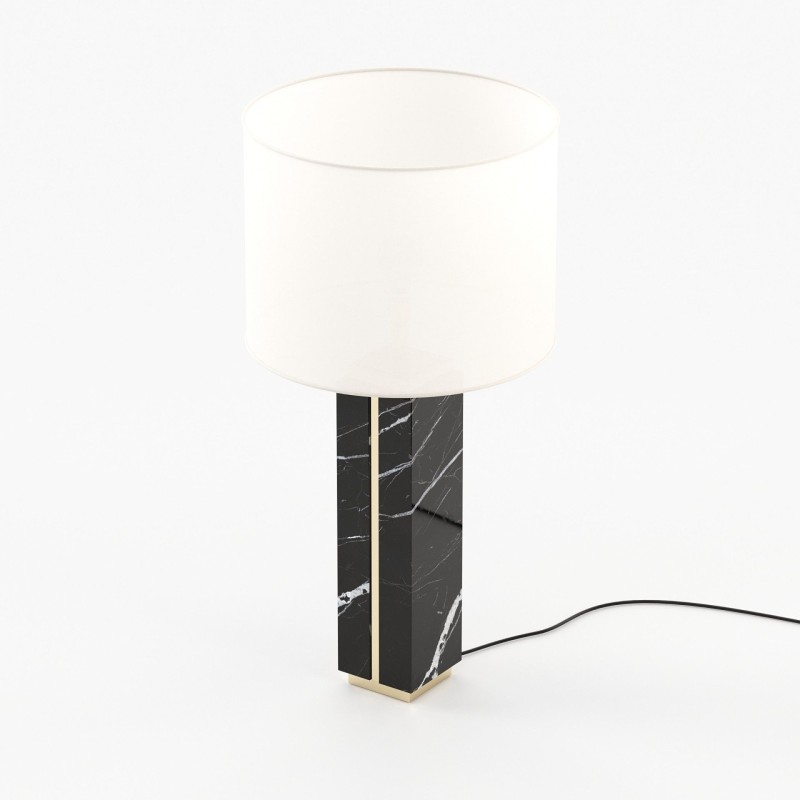 The lamp is made of wood, marble and metal, offering a robust structure and a modern aesthetic, ideal for a contemporary interior. The high-quality materials and careful finishes contribute to creating a welcoming and bright atmosphere in the room.