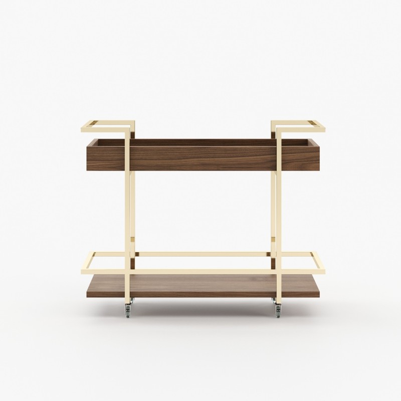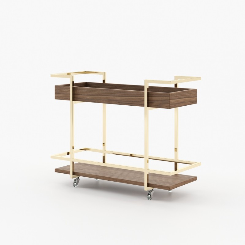 The wooden frame and metallic accents give this tea cart a contemporary look, while the metallic patina on the details adds a touch of sophistication. The generous dimensions, with a length of 100cm, allow for the display of several items at once.