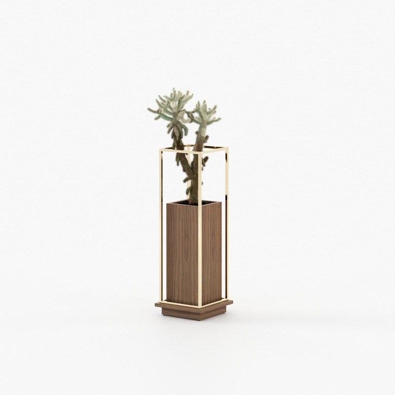 The Lanie Flower Pot by Laskasas fits perfectly into a contemporary interior, bringing a touch of nature and elegance with its walnut wood and matte finish.