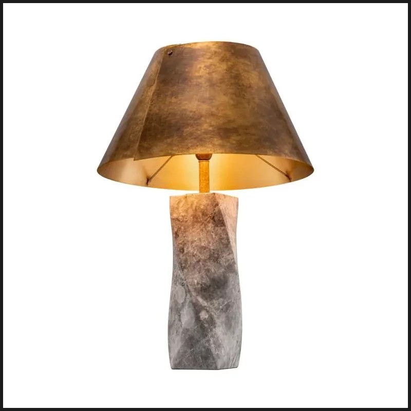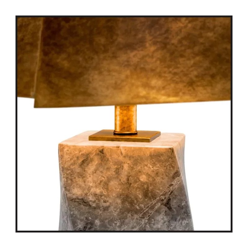 and gray marble, enhanced by a vintage brass metal lampshade,