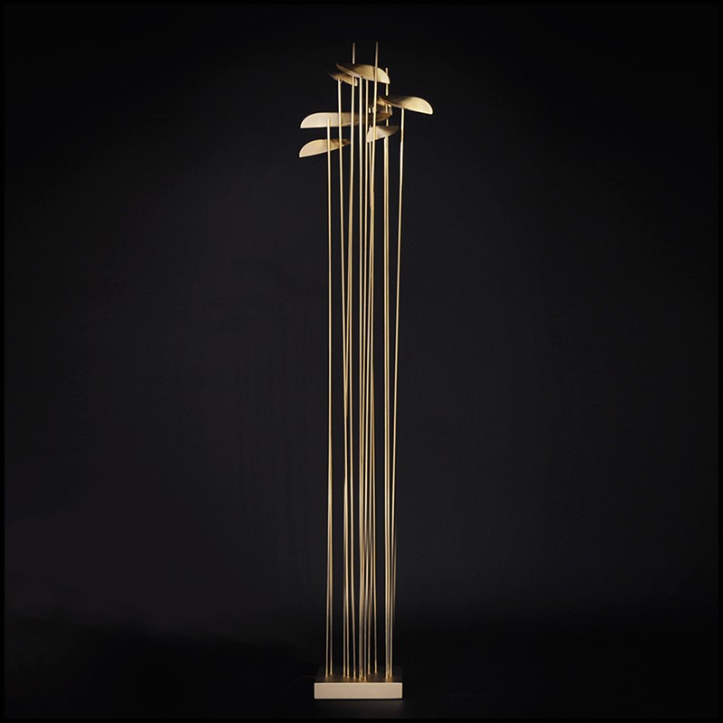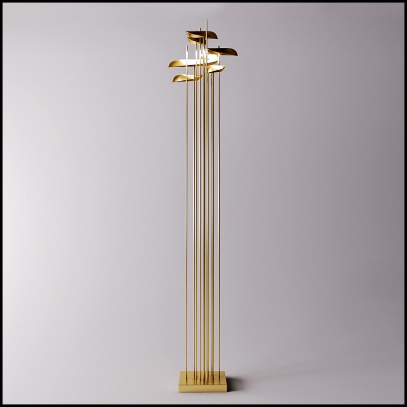 Floor Lamp Fins features polished brass rods on metal base in gold finish.