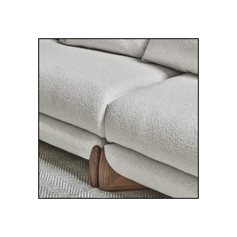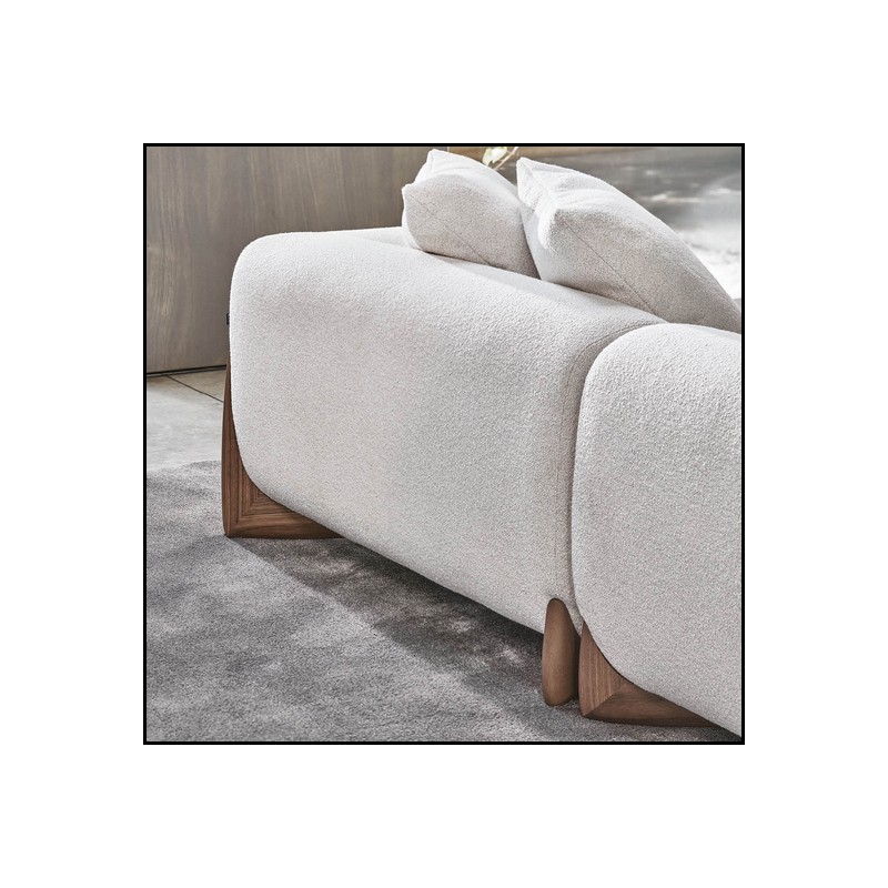 with its elegant canaletta walnut structure and refined bouclé fabric upholstery.