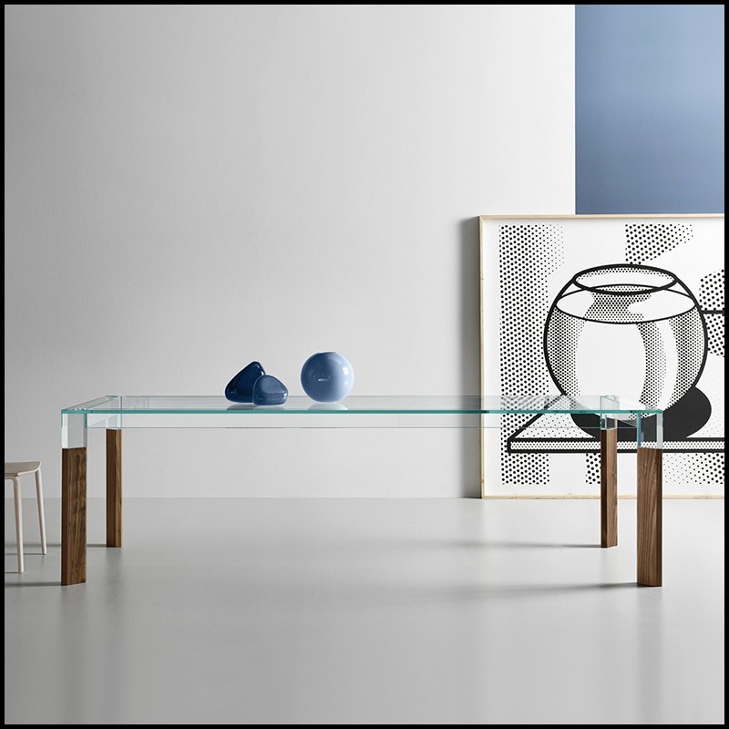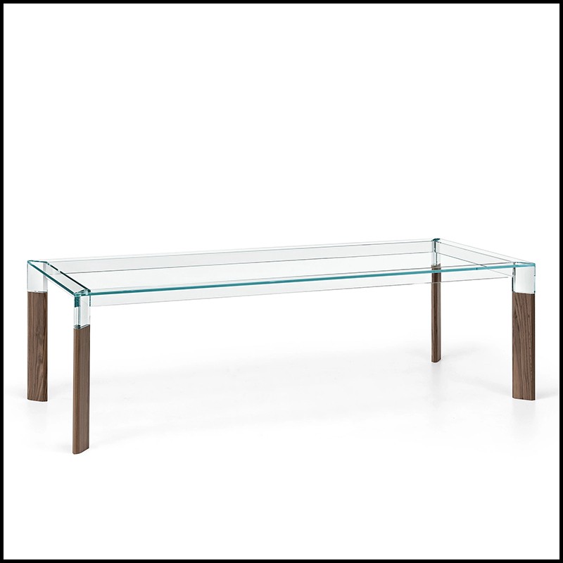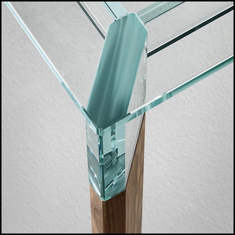 Its clear glass top is supported by four solid walnut legs, showcasing natural