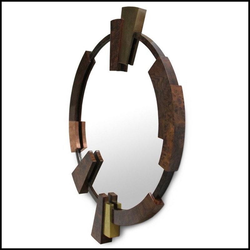Its frame in walnut burl and walnut veneer highlights the natural richness of the wood, while brass and copper accents enhance the piece with a warm and precious touch. The harmony of materials gives this mirror a look that is both noble and contemporary.