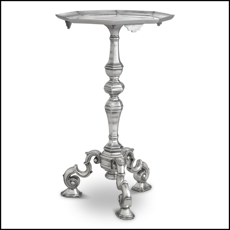 silver finish and a sculptural silhouette inspired by 18th-century baroque furniture.