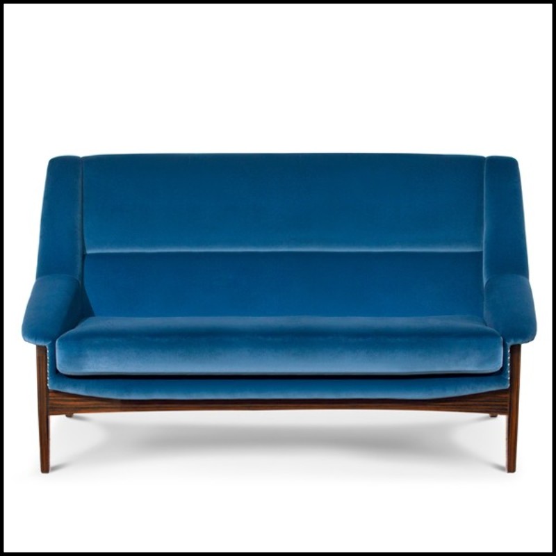 Its ebony wood structure highlights the richness of the material, while the blue cotton velvet upholstery adds softness, depth, and a modern touch. The combination of these elements gives the sofa a warm yet luxurious aesthetic.