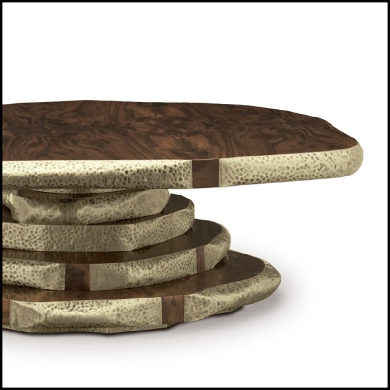 Crafted in rosewood veneer and walnut wood, this coffee table is enhanced with hand-hammered solid brass accents, adding texture, character, and a unique artisanal touch. The combination of materials creates a perfect balance between warmth and modernity.
