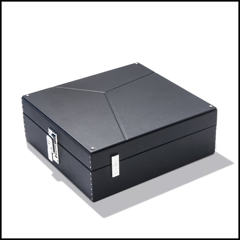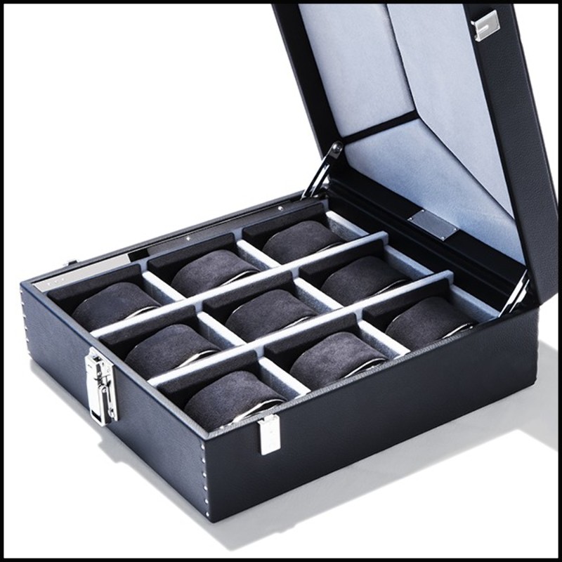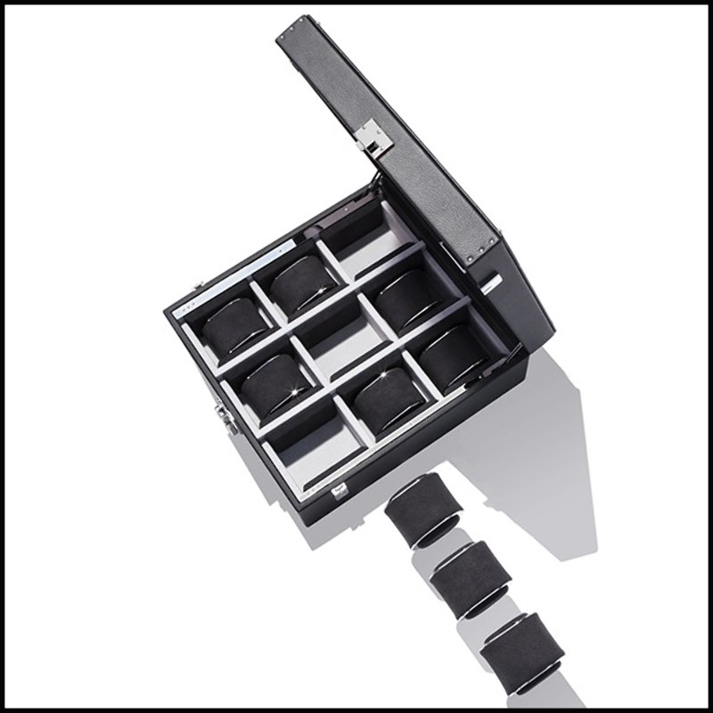 Box with black cowhide leather sheathing and details in polished nickel-plated brass 186-Luxury Nine Watch Black or Cognac