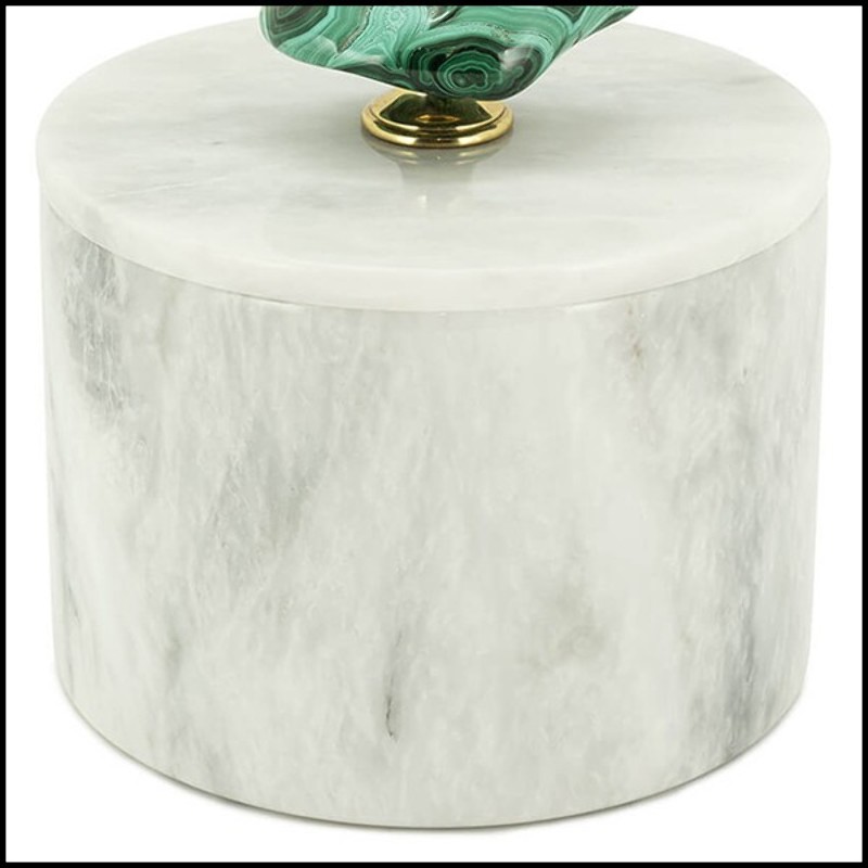 The Boîte Malachite Large by Pacific Compagnie is a true masterpiece, designed to add a touch of elegance to your interior decor. This luxury box in white marble features a lid made of genuine malachite, resting on a metal base with a refined gold finish. It is a high-end decorative storage accessory, perfect for storing your jewelry or other precious items in a luxury jewelry box.