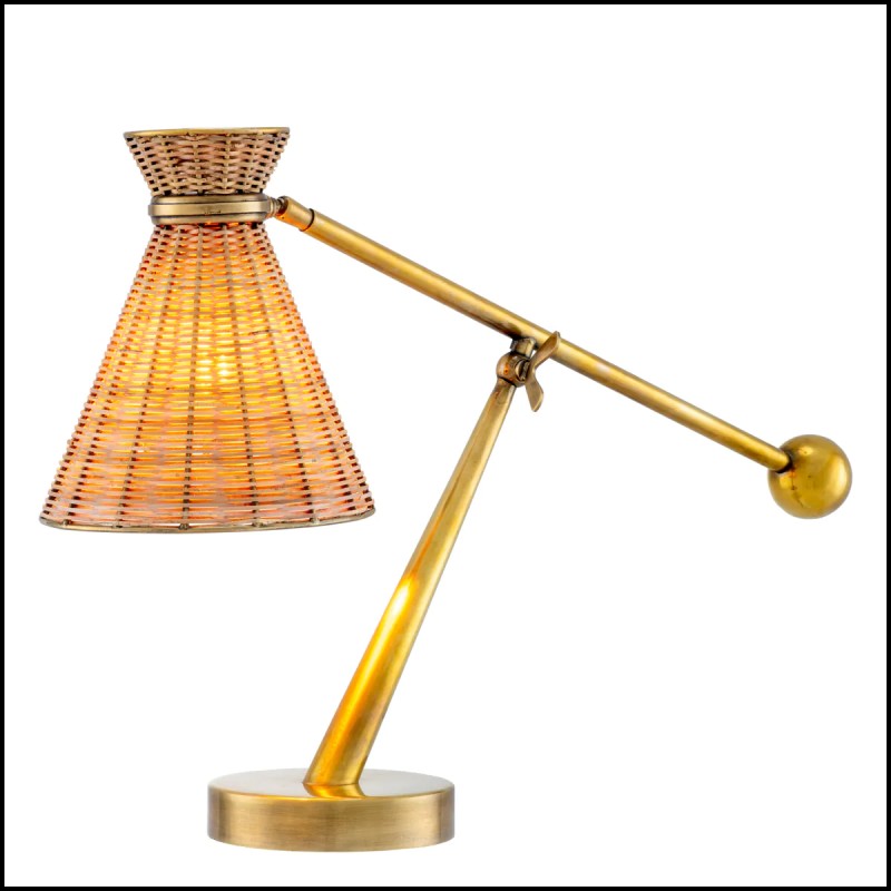 The rattan shade rests on a base with a refined vintage brass finish.
