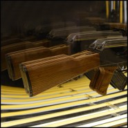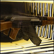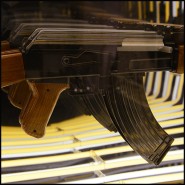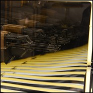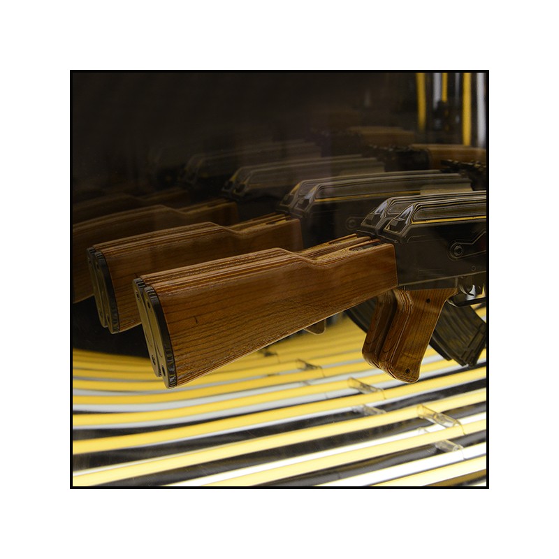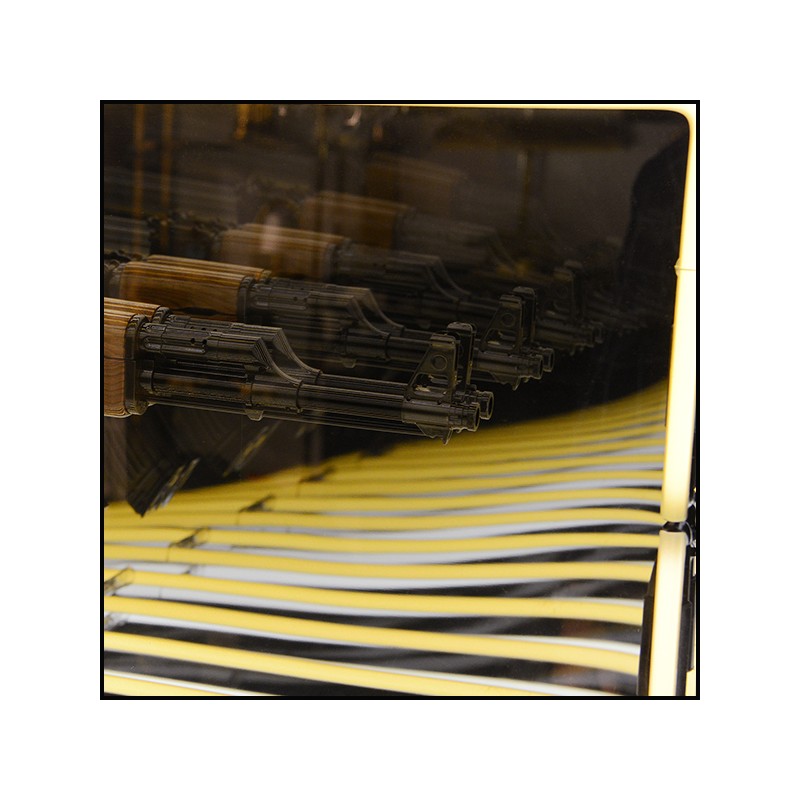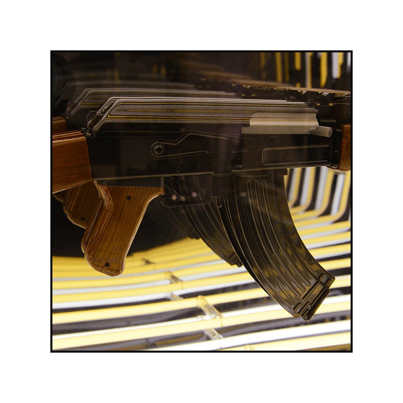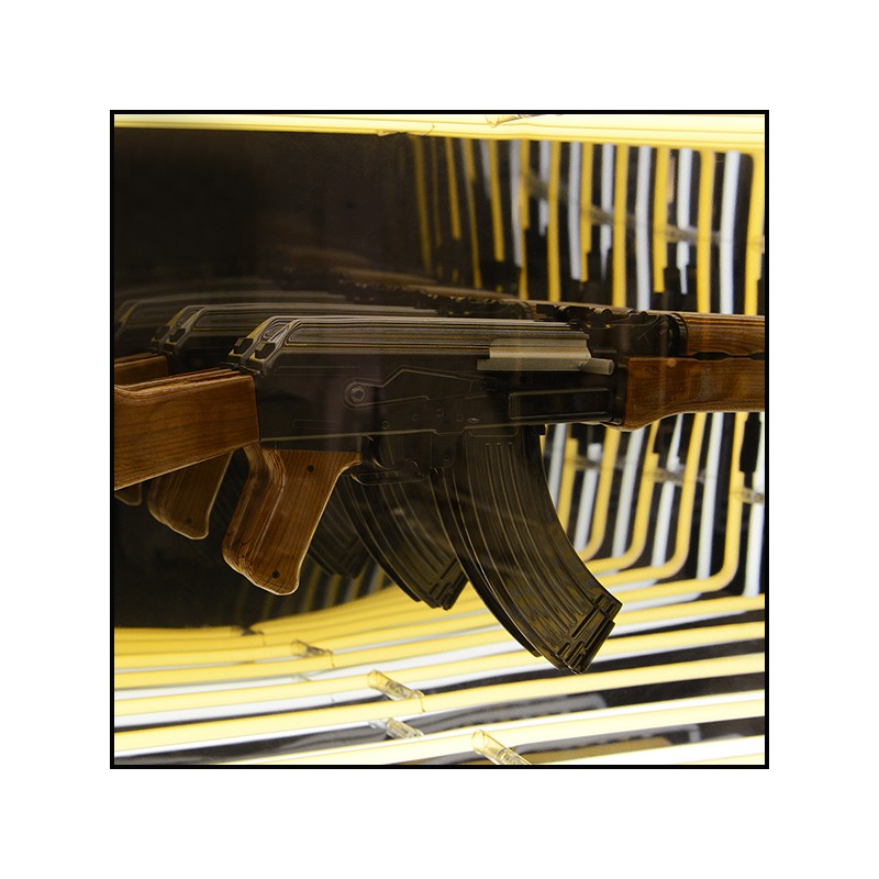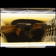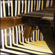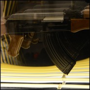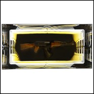 Art demo replica of a gun in resin, positioned at the center of the mirror.