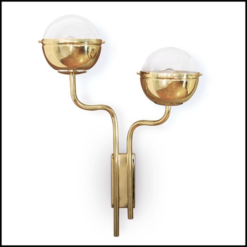 Crafted in solid brass, this wall light is enhanced by two transparent glass shades, diffusing a soft and harmonious glow. The combination of materials creates a subtle interplay of transparency and reflections, adding a modern and refined touch to your interior.
