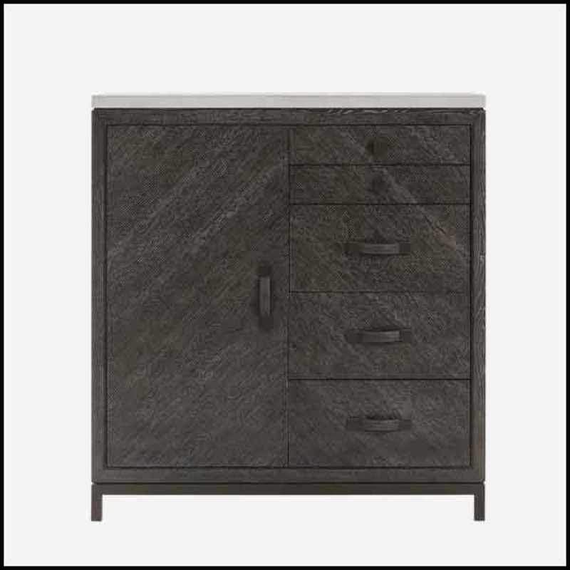 whilst the drawer fronts are finished with smart bronze or stitched leather handles.